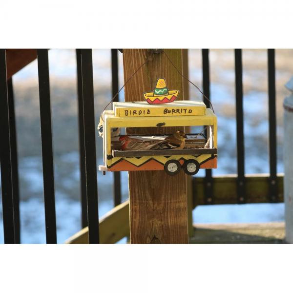 Birdie Burrito Food Truck Feeder adds charm to your yard! Includes a built in wire hanging system, bird safe, lead free paint, and easy to clean. Produced with wood from FSC well-managed forests.