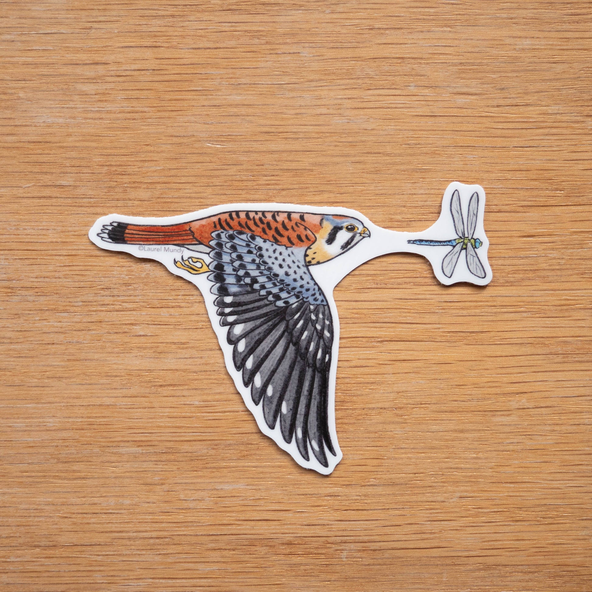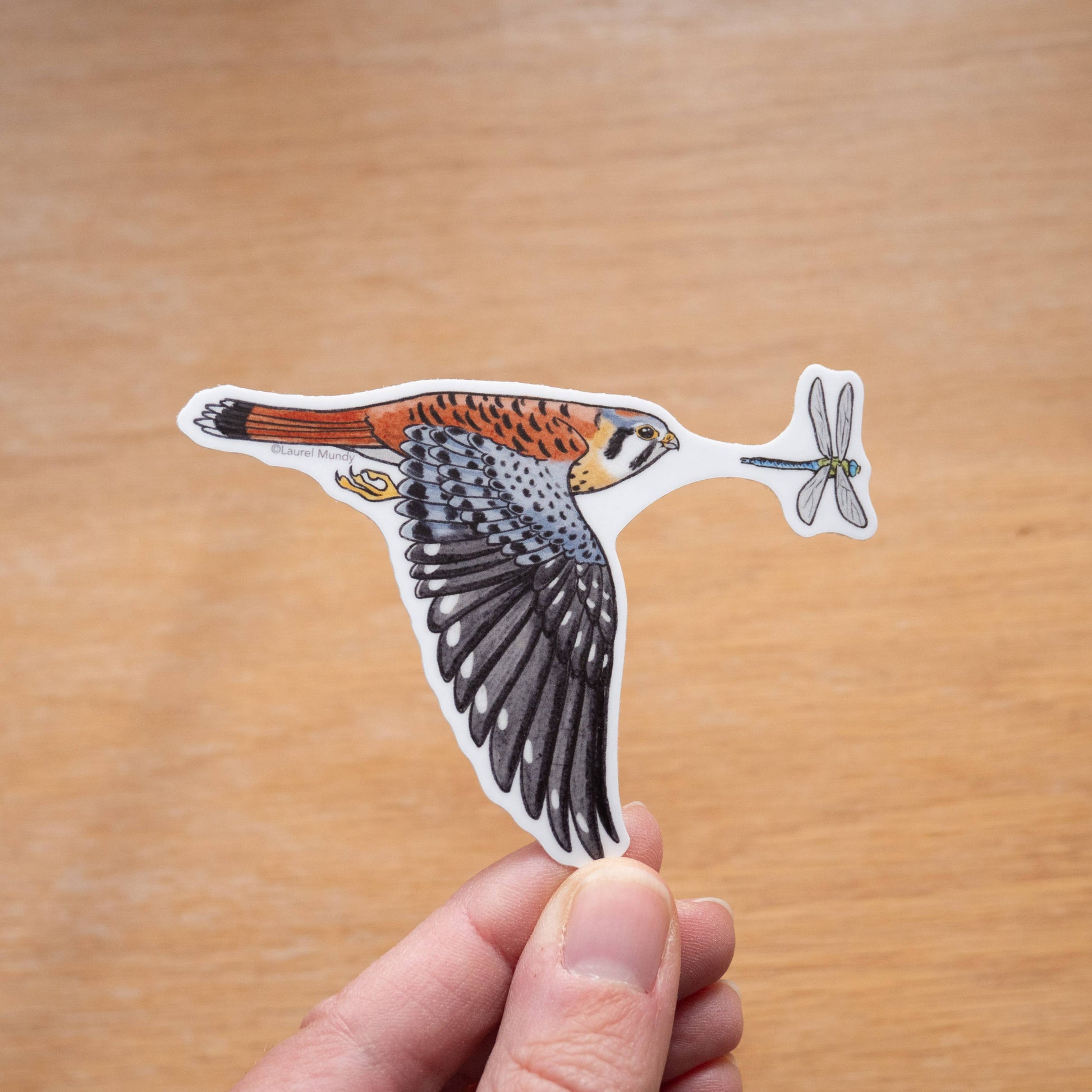 This 3" vinyl sticker features my original illustration of an American Kestrel chasing a dragonfly. Each sticker is printed on durable vinyl, weatherproof, dishwasher safe, and appropriate for all sorts of places including water bottles, cars, laptops, notebooks, etc. Indoor and outdoor safe. Expect a lifespan of at least 2-5 years.