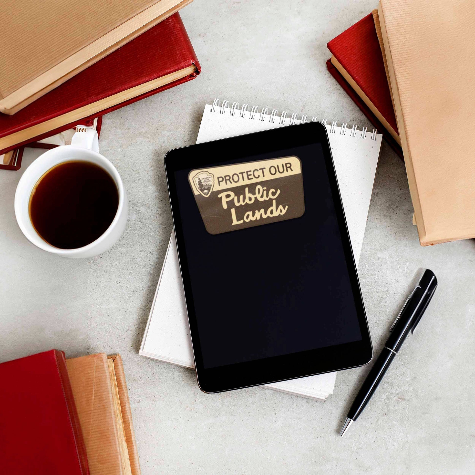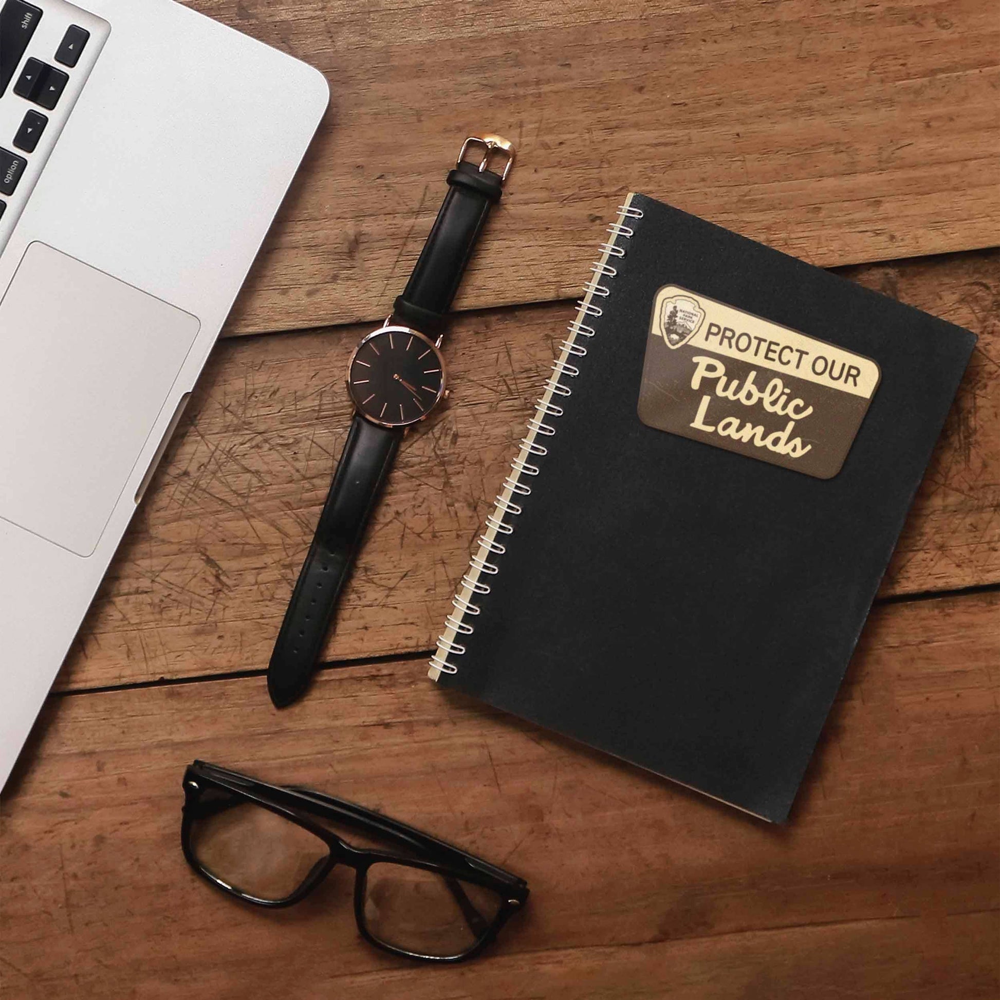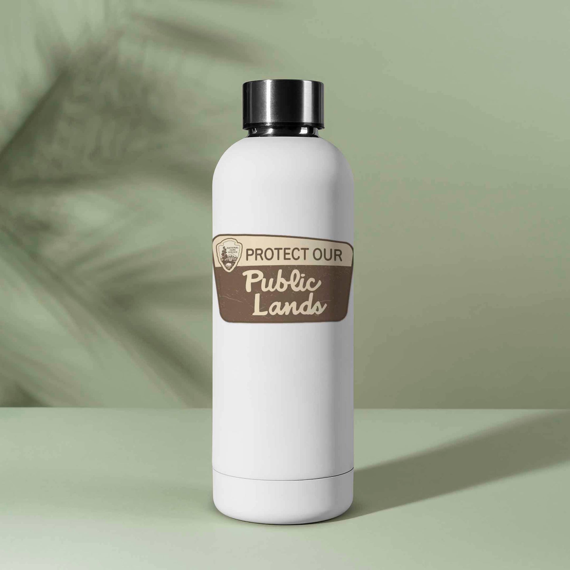 Protect Our Public Lands sticker, 3.25" wide laptop decal or bumper sticker size. Durable die-cut vinyl decal with a matte UV-resistant coating. Waterproof & weatherproof for indoor & outdoor use. Made in USA.